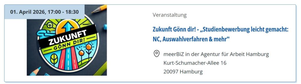 | 01.04.2026 | Zukunft Gönn‘ dir! Studienbewerbung leicht gemacht! 17-18:30 Uhr im meerbiz. Infor im Veranstaltungskalender der Jugendberufsagentur: Veranstaltungskalender | JBA Hamburg |
