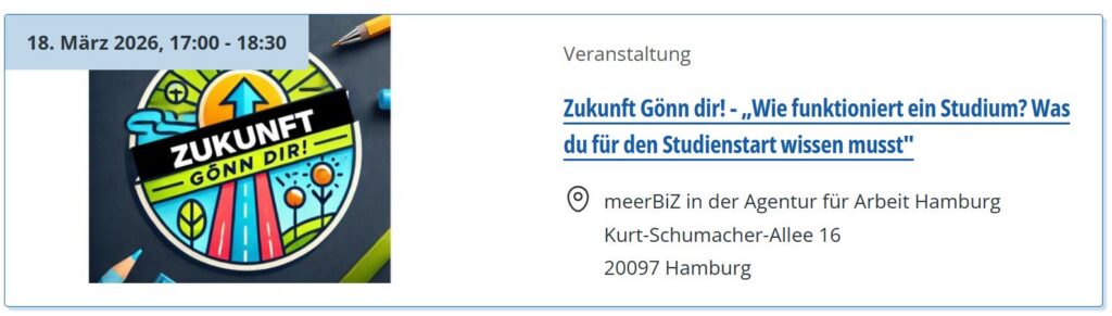 | 18.03.2026 | Zukunft Gönn‘ dir! Wie funktioniert ein Studium? 17-18:30 Uhr im meerbiz. Infor im Veranstaltungskalender der Jugendberufsagentur: Veranstaltungskalender | JBA Hamburg |
