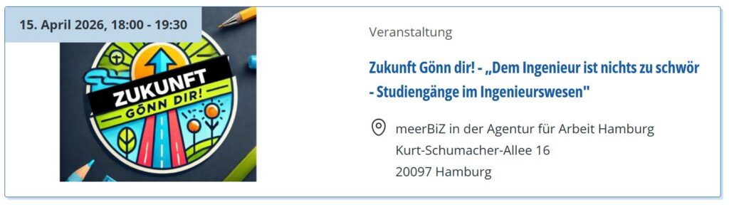 | 15.04.2026 | Zukunft Gönn‘ dir! Studiengänge im Ingenieurswesen. 18-19:30 Uhr im meerbiz. Infor im Veranstaltungskalender der Jugendberufsagentur: Veranstaltungskalender | JBA Hamburg |