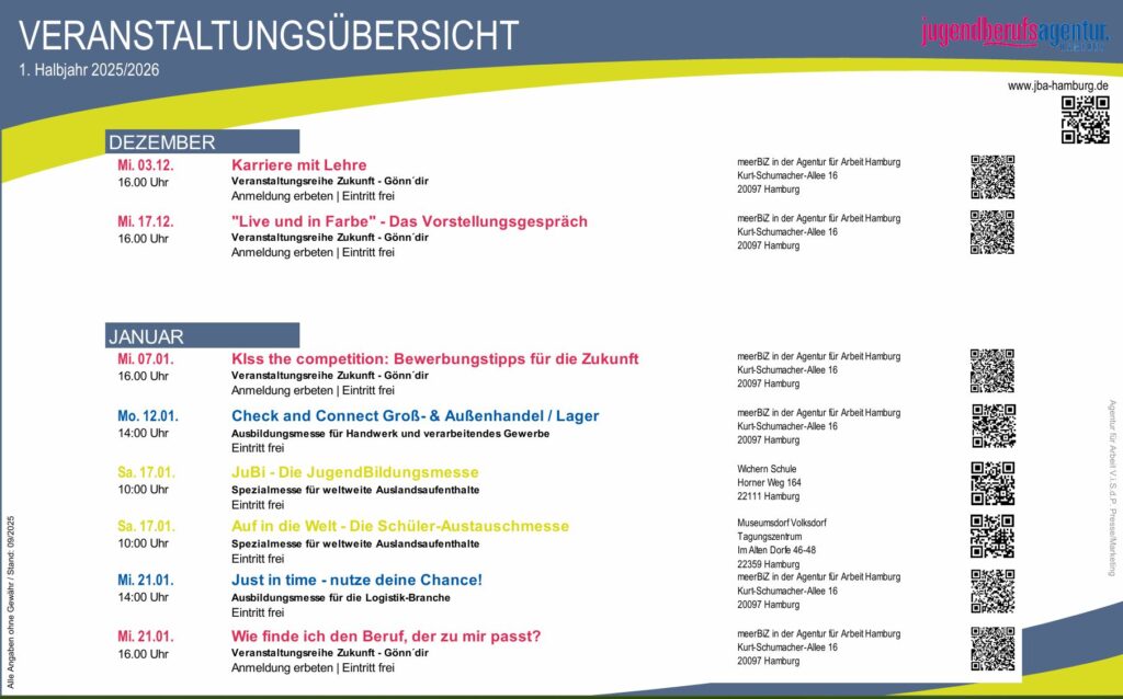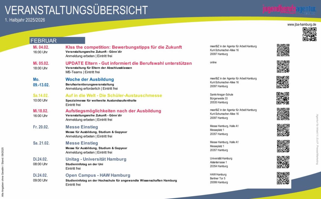 Veranstaltungen zur Berufsorientierung – live oder virtuell! Mit Scan-Codes für detaillierte Informationen zu den Veranstaltungen. Das aktuelle Plakat mit praktischen QR-Codes zu allen Veranstaltungen findest du hier!