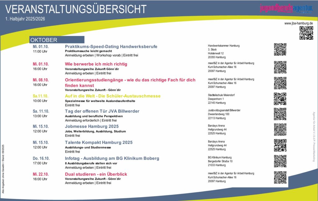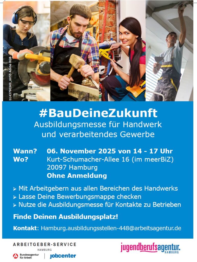 06.11.2025 | Ausbildungsmesse #BauDeineZukunft für das Handwerk und verarbeitende Gewerbe, 14:00 – 17:00 Uhr im meerBIZ, Agentur für Arbeit Hamburg-Mitte, Kurt-Schumacher-Allee 16, 20097 Hamburg. Weitere Infos siehe unten! |
