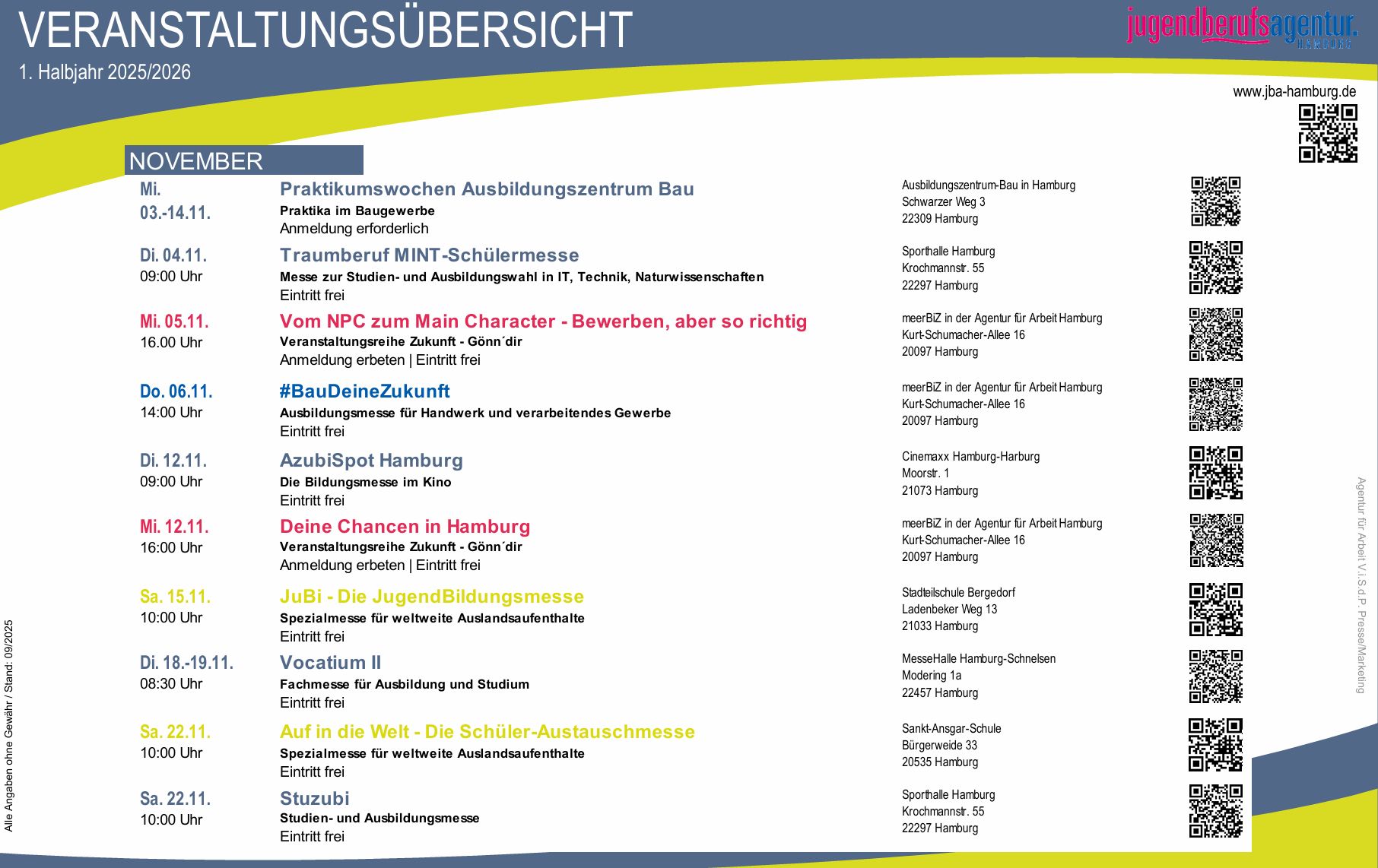06.11.2025 | Ausbildungsmesse #BauDeineZukunft für das Handwerk und verarbeitende Gewerbe, 14:00 – 17:00 Uhr im meerBIZ, Agentur für Arbeit Hamburg-Mitte, Kurt-Schumacher-Allee 16, 20097 Hamburg. Weitere Infos siehe unten! |