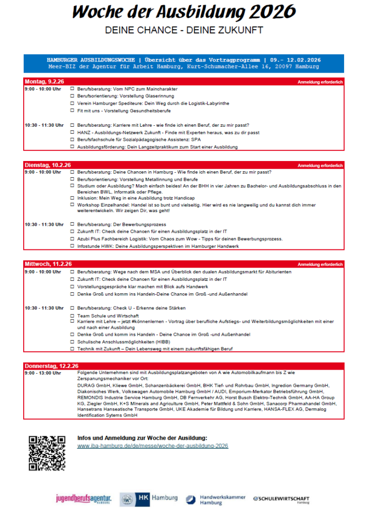 | 09.-12.02.2026 | Hamburger Woche der Ausbildung, verschiedene Workshops im meerBIZ in der Kurt-Schumacher-Allee 16, 20097 Hamburg, jeweils vormittags: Woche der Ausbildung 2026 | JBA Hamburg |