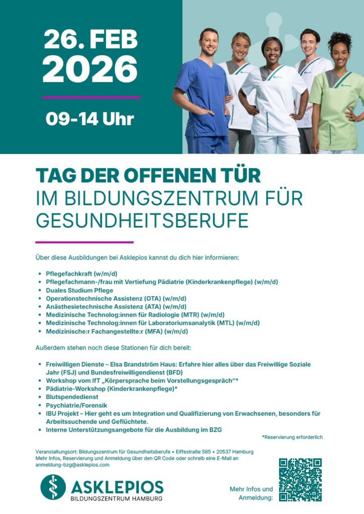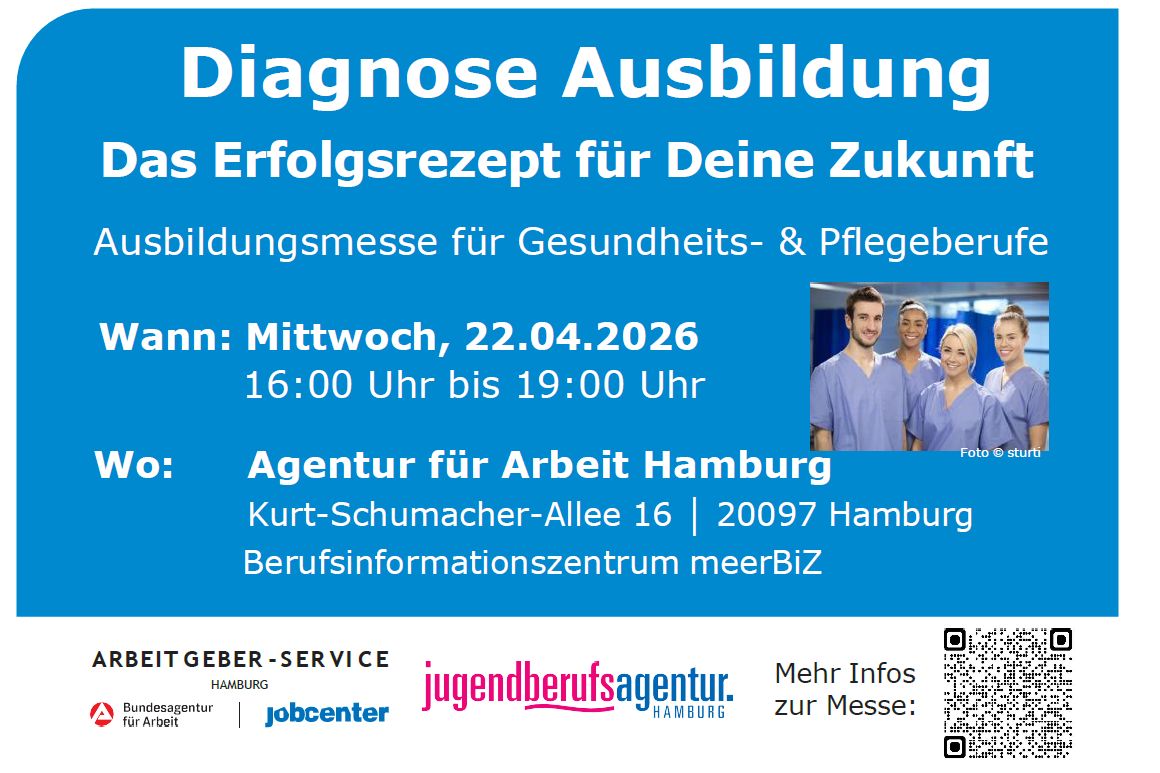 | 22.04.2026 | Ausbildungsmesse für Gesundheits- und Pflegeberufe, 16:00-19:00 Uhr, Berufsinformationszentrum („meerBIZ“) der Agentur für Arbeit, 2.Stock, Kurt-Schumacher-Alle 16, 20097 Hamburg. Anmeldung erforderlich über diesen Link. Weitere Infos siehe unten. |