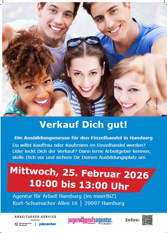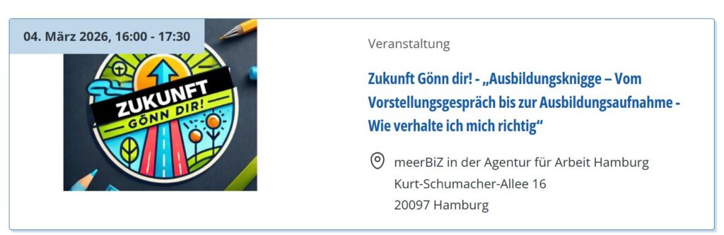 | 04.03.2026 | Gönn‘ Dir! Ausbildungsknigge – wie verhalte ich mich richtig? Veranstaltungsreihe der Jugendberufsagentur: 16-17:30 Uhr im meerbiz. Infos hier: Veranstaltungskalender | JBA Hamburg |