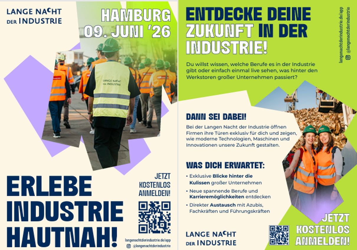 | 09.06.2026 | Lange Nacht der Industrie: Flyer siehe unten. Infos und Anmeldung hier: Unsere Regionen: Hamburg – LANGE NACHT DER INDUSTRIE |