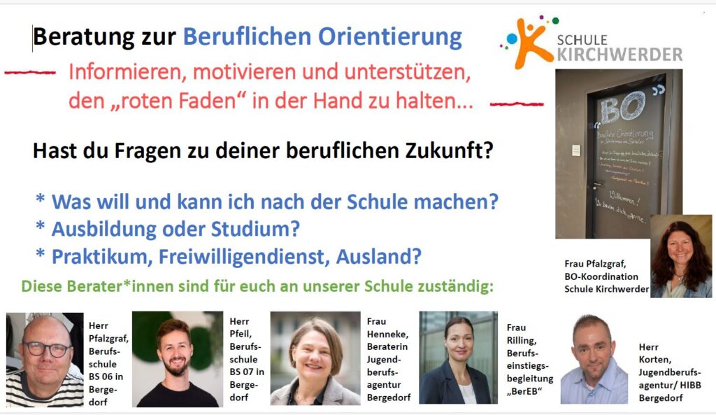 Herr Pfalzgraf aus der Berufsschule für Chemie, Agrarwirtschaft und Pharmazie bietet donnerstags und freitags während der Unterrichtszeit Beratungs- und Orientierungsgespräche für euch an. Er steht im ständigen Austausch mit den Klassenleitungen und bei Bedarf auch für Elterngespräche zur Verfügung. Erreichbar ist er unter thomas.pfalzgraf@kiwe.hamburg.de.