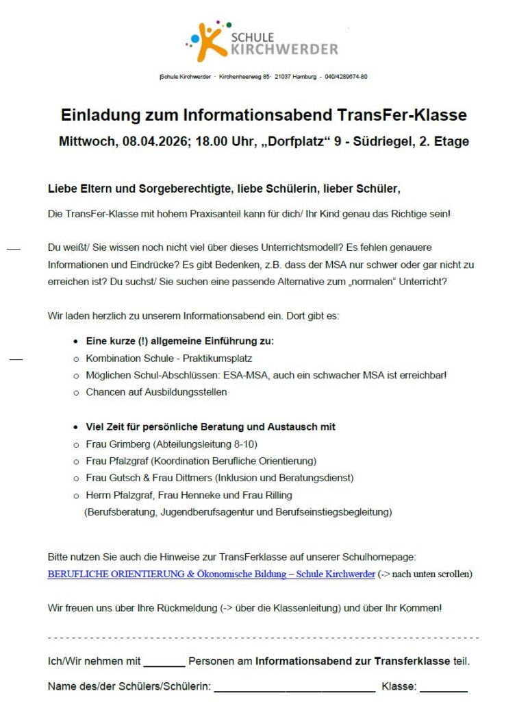 Einladung zum Infoabend TransFerklasse 2026 (für SuS und Eltern Jg. 9) am Mittwoch, 08.04.2026 um 18 Uhr auf dem „Dorfplatz“ 9